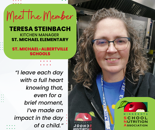 Member Spotlight. Teresa Steinbach, Kitchen Manager at St. Michael-Albertville Schools. To read past member spotlights, click here. Nominate a Colleague You Admire! Help recognize the hard work of our colleagues in the school nutrition profession who go above and beyond. The MSNA and SNA Awards programs highlight the outstanding and important work of our members and state affiliates. Members and state associations are eligible for a variety of honors that recognize their achievements in school foodservice, leadership, membership recruitment and professional development. Nominations for 2026 will open early 2026.